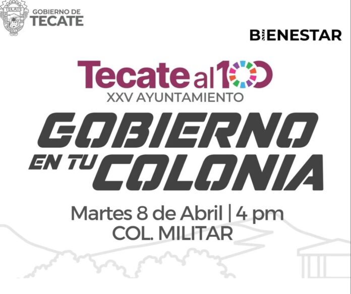 TECATE BC, 07 de abril de 2025.- El Gobierno Municipal de Tecate, a través de la Dirección de Bienestar Municipal, invita cordialmente a todas y todos los vecinos de la Colonia Militar a participar en una nueva edición de la jornada Gobierno en tu Colonia, que se llevará a cabo el próximo martes 08 de abril en las canchas de la colonia.