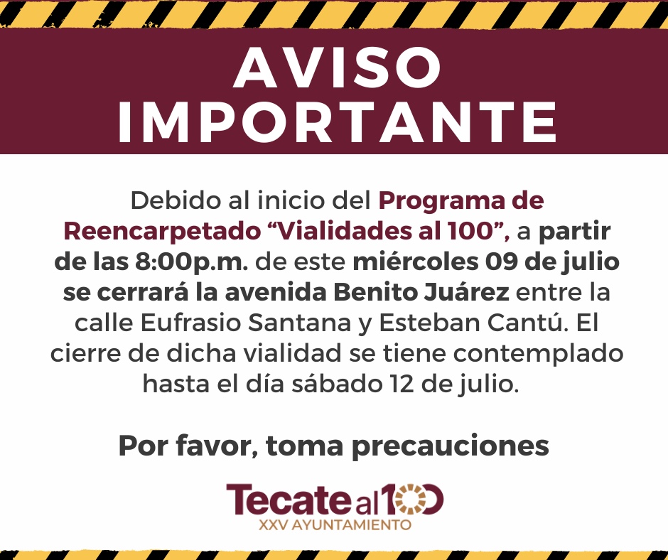 TECATE BC, 09 de julio de 2025.- El Gobierno de Tecate informa a la ciudadanía que, como parte del arranque del Programa de Reencarpetado “Vialidades al 100”, se realizará el cierre temporal de la avenida Benito Juárez, en el tramo comprendido entre la calle Eufrasio Santana y Esteban Cantú.