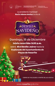 PLAYAS DE ROSARITO BC, 10 de diciembre de 2024. – La presidenta municipal, Rocio Adame Muñoz, anunció en su conferencia matutina “Nos Toca Comunicar” que el próximo domingo 15 de diciembre se llevará a cabo el tradicional «Desfile Navideño 2025» a partir de las 5:30 de la tarde sobre el bulevar Benito Juárez.