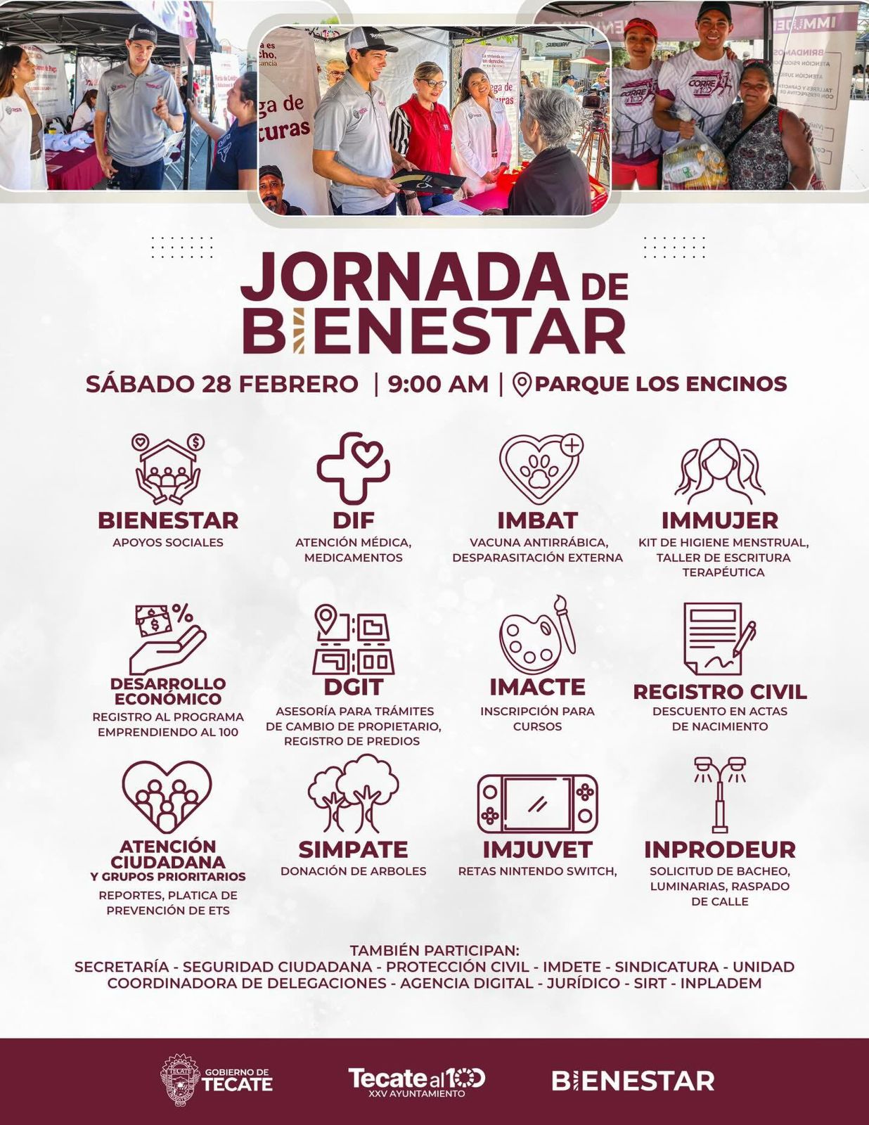 TECATE BC, 27 de febrero de 2026.- El Gobierno de Tecate informa a la ciudadanía que este sábado 28 de febrero se llevará a cabo la Jornada de Bienestar en el Parque Los Encinos, en un horario de 9:00 de la mañana a 1:00 de la tarde.