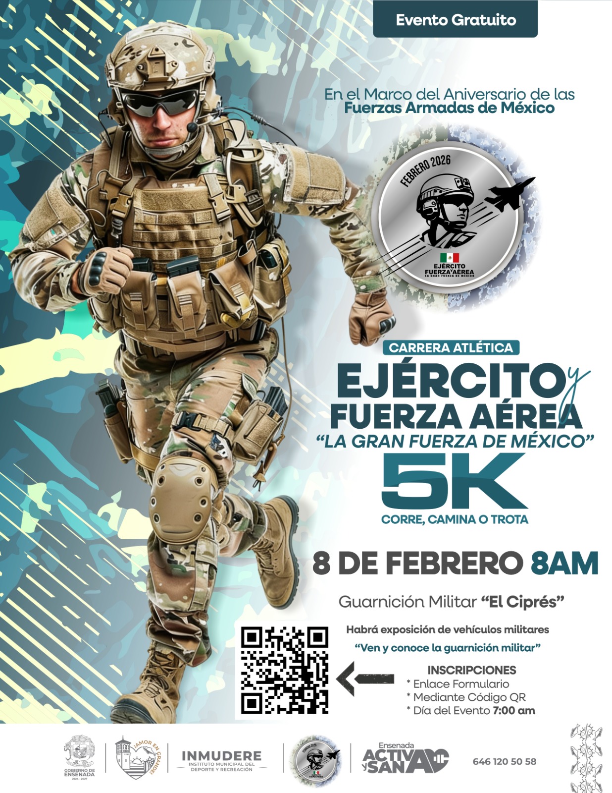 ENSENANDA BC, 29 de enero de 2026.- El Instituto Municipal del Deporte y Recreación de Ensenada (INMUDERE), en coordinación con la Guarnición Militar “El Ciprés”, invita a la comunidad a participar en la Carrera Atlética “La Gran Fuerza de México” 5K, evento que se realiza en el marco del Aniversario de las Fuerzas Armadas de México, como parte del programa Ensenada Activa y Sana.