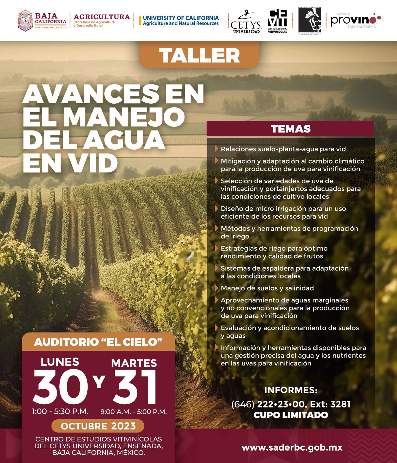 ENSENADA BC, 24 de octubre de 2023.- Con el propósito de informar y trabajar en el mejoramiento de prácticas para aprovechar el recurso hídrico en el Valle de Guadalupe, la Secretaría de Agricultura y Desarrollo Rural (SADERBC) invita a las personas interesadas a participar en el Taller de Avances en el Manejo de Agua en Vid.