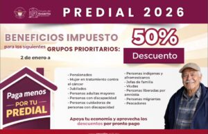 Durante los primeros meses del año, las y los contribuyentes pueden acceder a los descuentos por pronto pago, que contemplan un 10% de descuento en enero, 7% en febrero y 5% en marzo. Asimismo, se mantienen los estímulos del 50% para grupos prioritarios, entre ellos personas adultas mayores, pensionados y jubilados, personas con discapacidad y sus cuidadores, mujeres en tratamiento contra el cáncer, jefas de familia, viudas, personas indígenas y afromexicanas, personas migrantes, pescadores y otros sectores contemplados en la ley.
