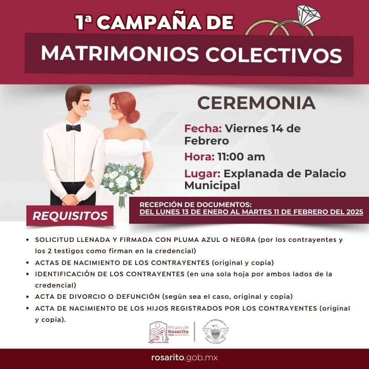 PLAYAS DE ROSARITO BC, 10 de febrero de 2025 – El gobierno municipal de Playas de Rosarito informa que el plazo para la recepción de documentos para la ceremonia de “Matrimonios Colectivos 2025”, vence el miércoles 12 de febrero a las 15:00 horas.