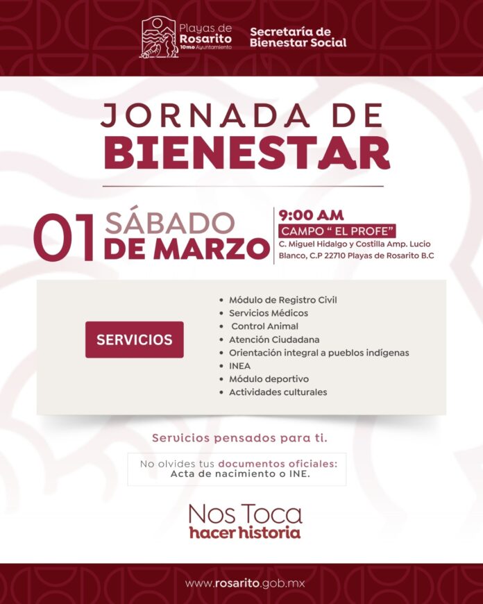 PLAYAS DE ROSARITO BC, 28 de febrero de 2025.- La Secretaría de Bienestar Social de Playas de Rosarito, extiende una cordial invitación a la comunidad rosaritense para participar en la próxima Jornada de Bienestar que se llevará a cabo el sábado 01 de marzo en Campo El Profe, ubicado en la colonia Ampliación Lucio Blanco.