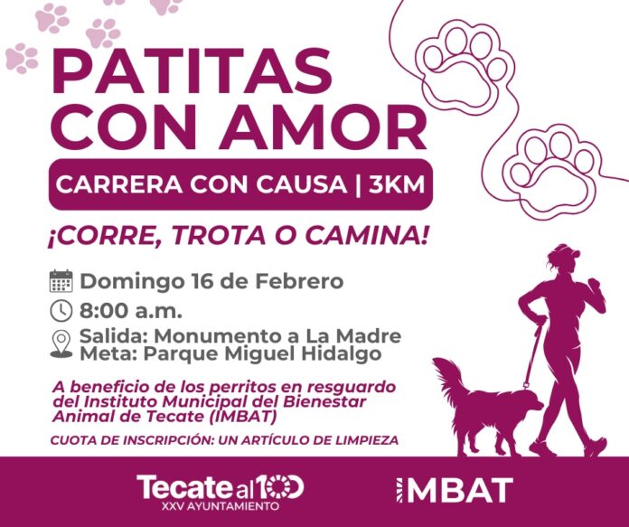 TECATE BC, 31 de enero de 2025.- El Gobierno Municipal de Tecate, encabezado por el alcalde Román Cota, a través del Instituto Municipal del Bienestar Animal de Tecate (IMBAT), invita a toda la comunidad a participar en la carrera con causa «Patitas con Amor», un recorrido de 3 kilómetros que busca recaudar apoyo para los perritos en resguardo del instituto.