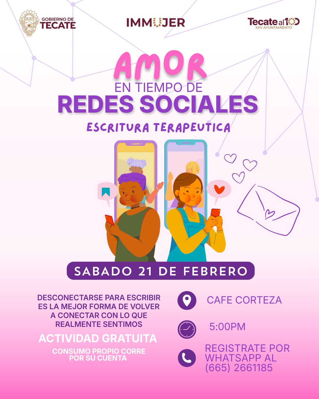 TECATE BC, 20 de febrero de 2026.- Con el propósito de generar espacios de reflexión y bienestar emocional, el Gobierno de Tecate, a través del Instituto Municipal de la Mujer (IMMUJER), invita a la comunidad a participar en la actividad “Amor en Tiempo de Redes Sociales: Escritura Terapéutica”, una experiencia diseñada para promover la conexión personal y el manejo saludable de las emociones en la era digital.