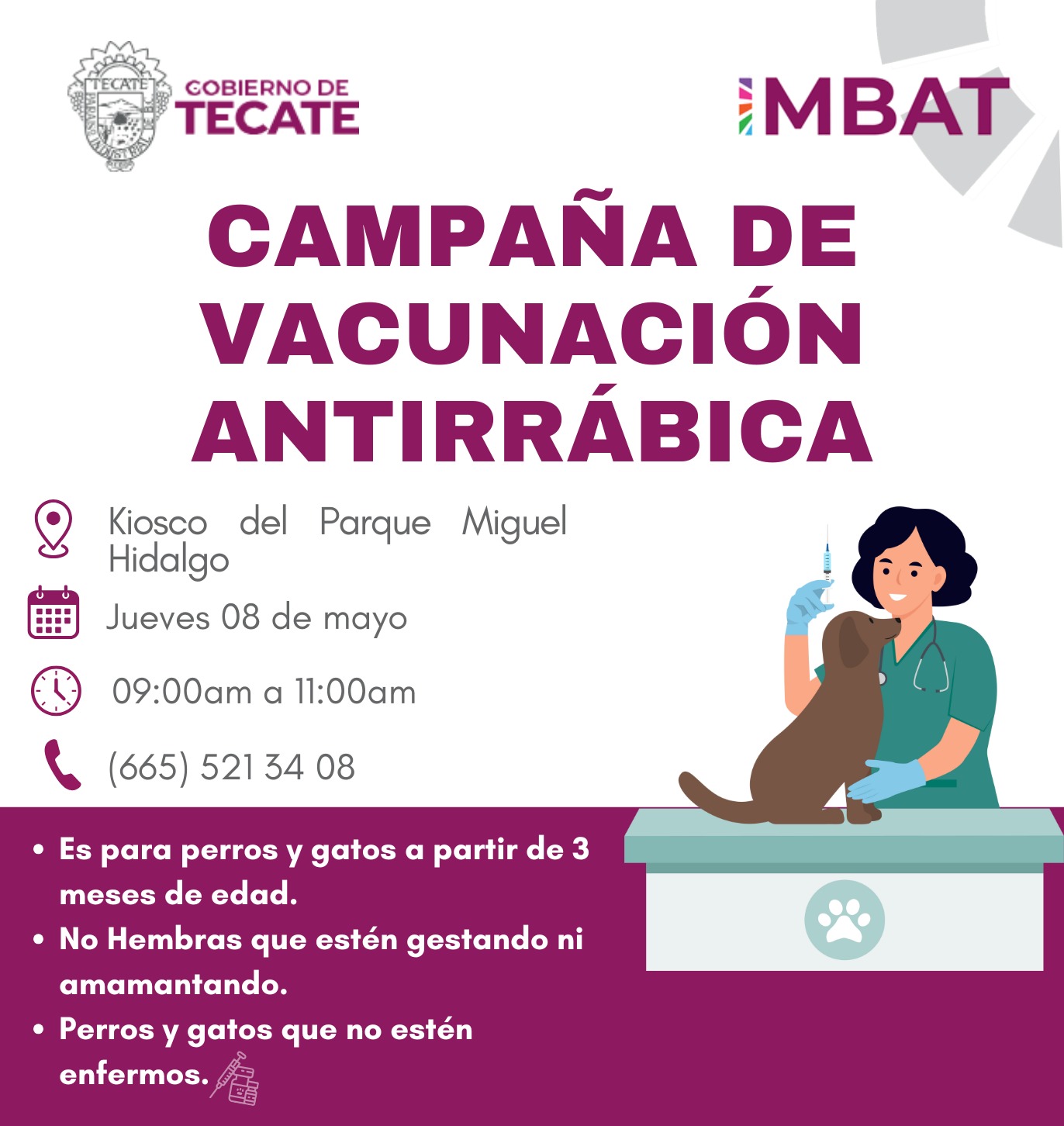 TECATE BC, 30 de abril de 2025. — Con el objetivo de promover la salud pública y el bienestar animal en el municipio, el Gobierno de Tecate, a través del Instituto Municipal de Bienestar Animal de Tecate (IMBAT), llevará a cabo una jornada gratuita de vacunación antirrábica dirigida a perros y gatos del municipio.