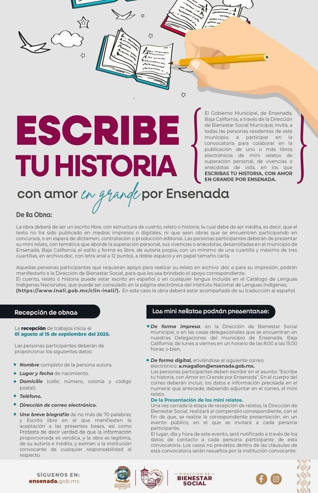 ENSENADA BC, 08 de julio de 2025.- Compartir historias de superación que motiven a la población a luchar por sueños, es el objetivo de la convocatoria “Escribe tu historia con amor en grande por Ensenada”.