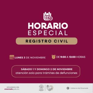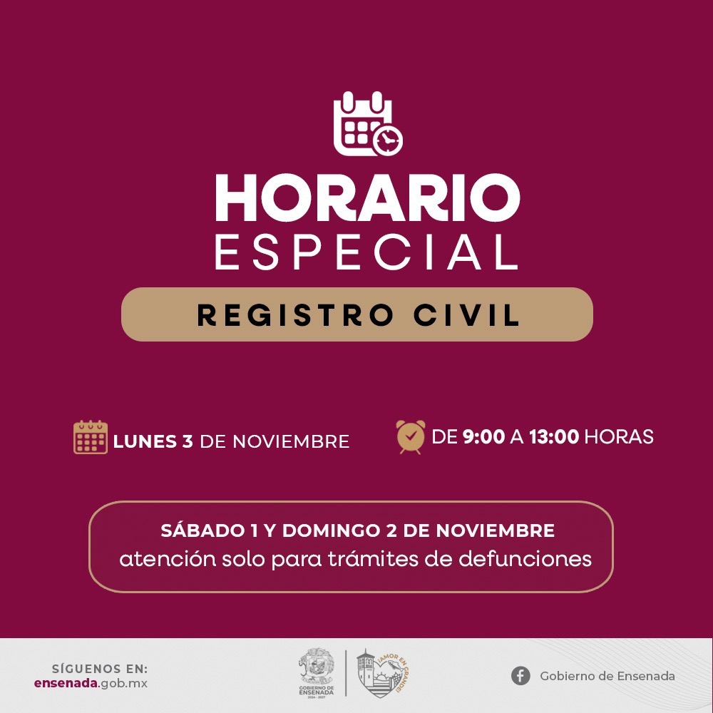 La Oficialía Mayor del Gobierno de Ensenada dio a conocer que esta medida aplica para todo el personal, sin embargo, para apoyar a la población ensenadense, las Cajas Recaudadoras de la Casa Municipal y la Oficialía del Registro Civil, permanecerán abiertas el lunes 3 de noviembre en un horario de las 9:00 a las 13:00 horas.