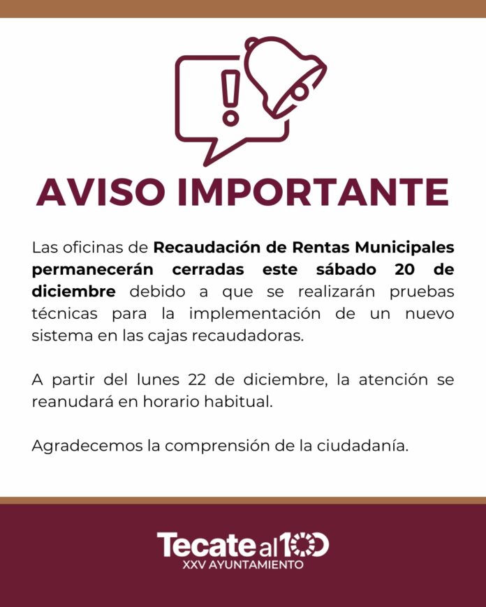 TECATE BC, a 19 de diciembre de 2025.– El Gobierno de Tecate informa a la ciudadanía que este sábado 20 de diciembre las oficinas de Recaudación de Rentas Municipales permanecerán cerradas al público, debido a la realización de pruebas técnicas para la implementación de un nuevo sistema en las cajas recaudadoras.