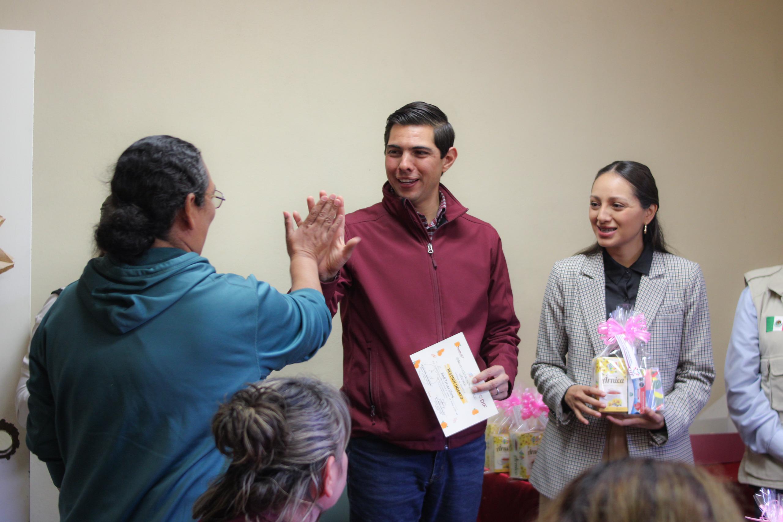 Cota Muñoz y Herrera Soto entregaron reconocimientos a las participantes de los tres talleres impartidos por personal especializado y compartieron un momento de convivencia con ellas, en el cual el alcalde refrendó el compromiso del XXV Ayuntamiento de Tecate de atender a las personas que más necesitan.