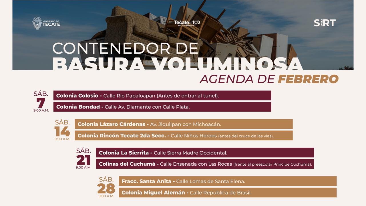 TECATE BC, 06 de febrero de 2026.- La unidad de Servicios Integrales de Residuos de Tecate (SIRT) presentó la agenda correspondiente al mes de febrero del programa Contenedor de Basura Voluminosa, una acción que facilita a la ciudadanía la correcta disposición de residuos de gran tamaño.