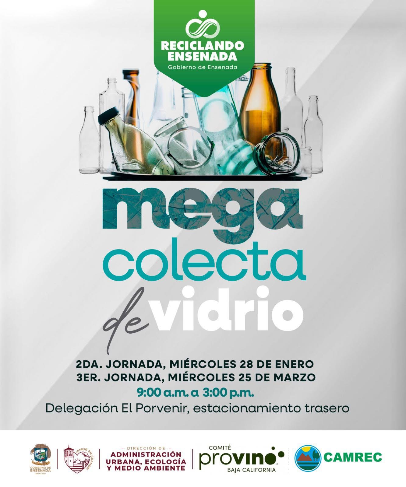 Ensenada, B.C.- Domingo 25 de enero de 2026.- Como parte de una política pública orientada al cuidado del medio ambiente, la economía circular y la corresponsabilidad social, el Gobierno de Ensenada, encabezado por la alcaldesa Claudia Agatón Muñiz, impulsa dos jornadas de Mega Colecta de Vidrio en la delegación municipal de El Porvenir.