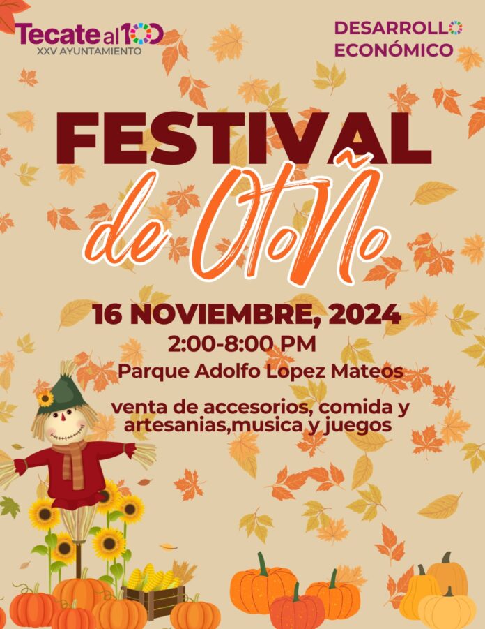 TECATE BC, 04 de noviembre de 2024.- Para impulsar el talento y la economía local, la Dirección de Desarrollo Económico del Gobierno de Tecate se complace en invitar a la comunidad a su Festival de Otoño 2024, que se llevará a cabo el sábado 16 de noviembre de 14:00 a 20:00 horas en el Parque Adolfo López Mateos.