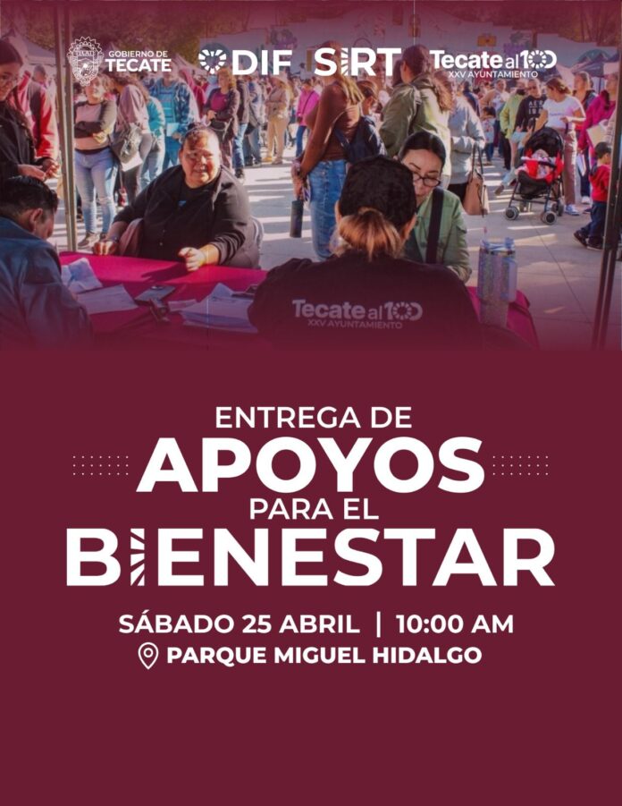 TECATE BC, 23 de abril de 2026.– Con el compromiso de atender de manera directa las necesidades de la población, el Gobierno de Tecate llevará a cabo este sábado 25 de abril una jornada de Entrega de Apoyos para el Bienestar, acercando soluciones reales a las familias tecatenses a través de acciones coordinadas entre distintas dependencias municipales.