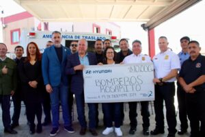 PLAYAS DE ROSARITO BC, 23 de diciembre de 2024.- La presidenta municipal, Rocio Adame Muñoz, recibió un donativo para el Heroico Cuerpo de Bomberos de Rosarito por parte de la empresa Hyundai México; Este consistió en una ambulancia totalmente equipada y un cheque por 10 mil dólares, lo cual fortalecerá significativamente la capacidad de respuesta ante emergencias en el municipio.