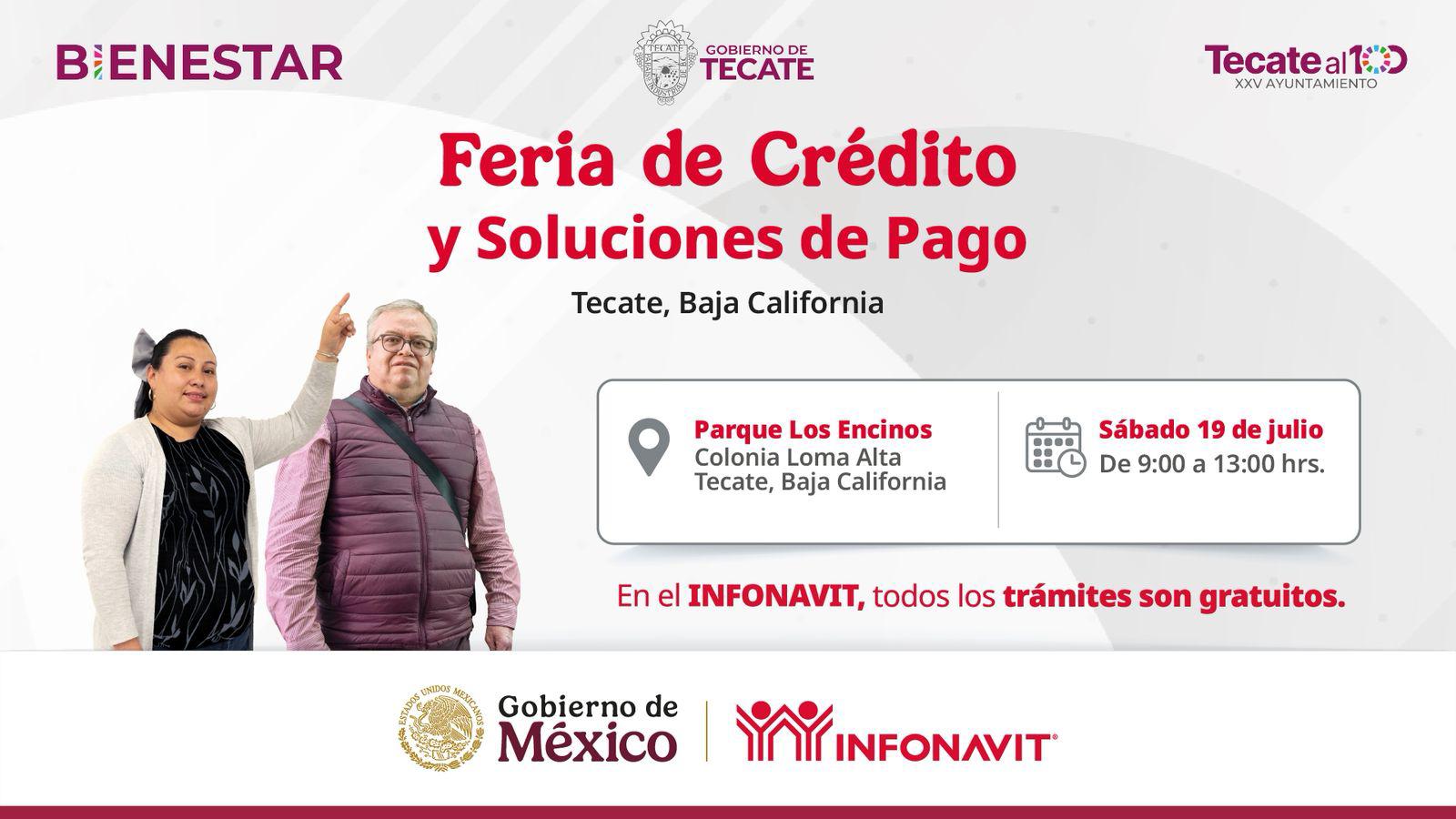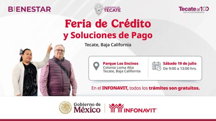 TECATE BC, 15 de julio de 2025.– El Gobierno de Tecate invita a la ciudadanía a participar en la Feria de Crédito y Soluciones de Pago INFONAVIT, que se realizará el próximo sábado 19 de julio, de 9:00 a 13:00 horas, en el Parque Los Encinos, como parte de la Jornada de Bienestar, cuyo objetivo es acercar los programas y servicios del Gobierno Municipal a todas las familias tecatenses.