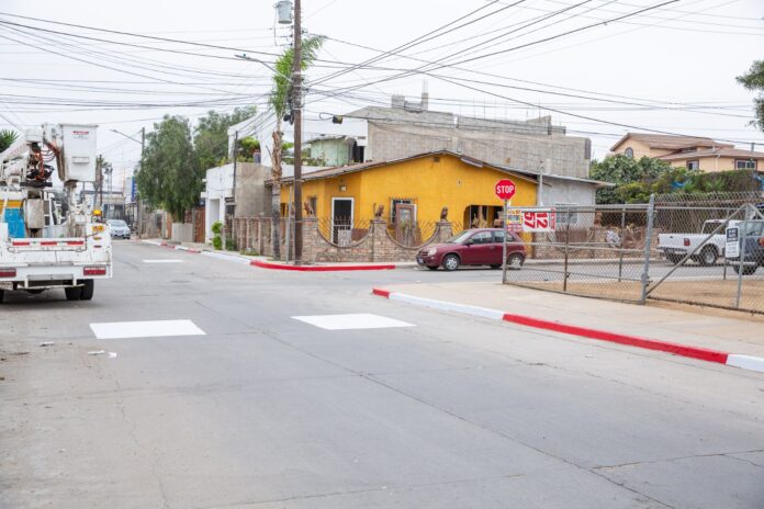 Playas de Rosarito.- Personal de la Dirección de Servicios Urbanos del Ayuntamiento de Playas de Rosarito inició esta mañana, labores de pintado de banquetas en color blanco sobre la calle Mar Mediterráneo, en la Zona Centro, con el objetivo de permitir que residentes y visitantes puedan estacionar sus vehículos de manera segura y ordenada.