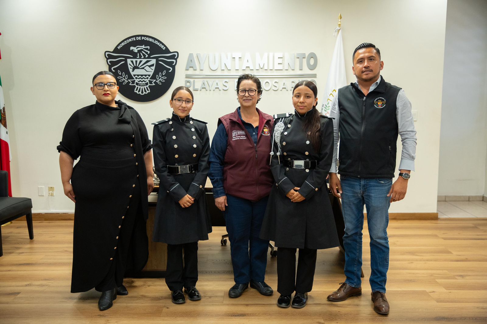 PLAYAS DE ROSARITO BC, 07 de abril de 2026.- La presidenta municipal de Playas de Rosarito, Rocío Adame Muñoz, sostuvo una reunión con el delegado de Primo Tapia, Jaime Peña, así como con integrantes de la escolta delegacional, con el objetivo de atender la solicitud para la conformación de una banda de guerra representativa en la zona.