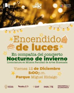 A las 5:00 p.m., se realizará el esperado Encendido de Luces, acompañado del concierto “Nocturno de Invierno”, interpretado por estudiantes de la Licenciatura en Música de la Facultad de Artes Ensenada de la UABC, quienes presentarán un emotivo repertorio con acordeón, piano, coro y orquesta que llenará de magia el corazón del Pueblo Mágico.