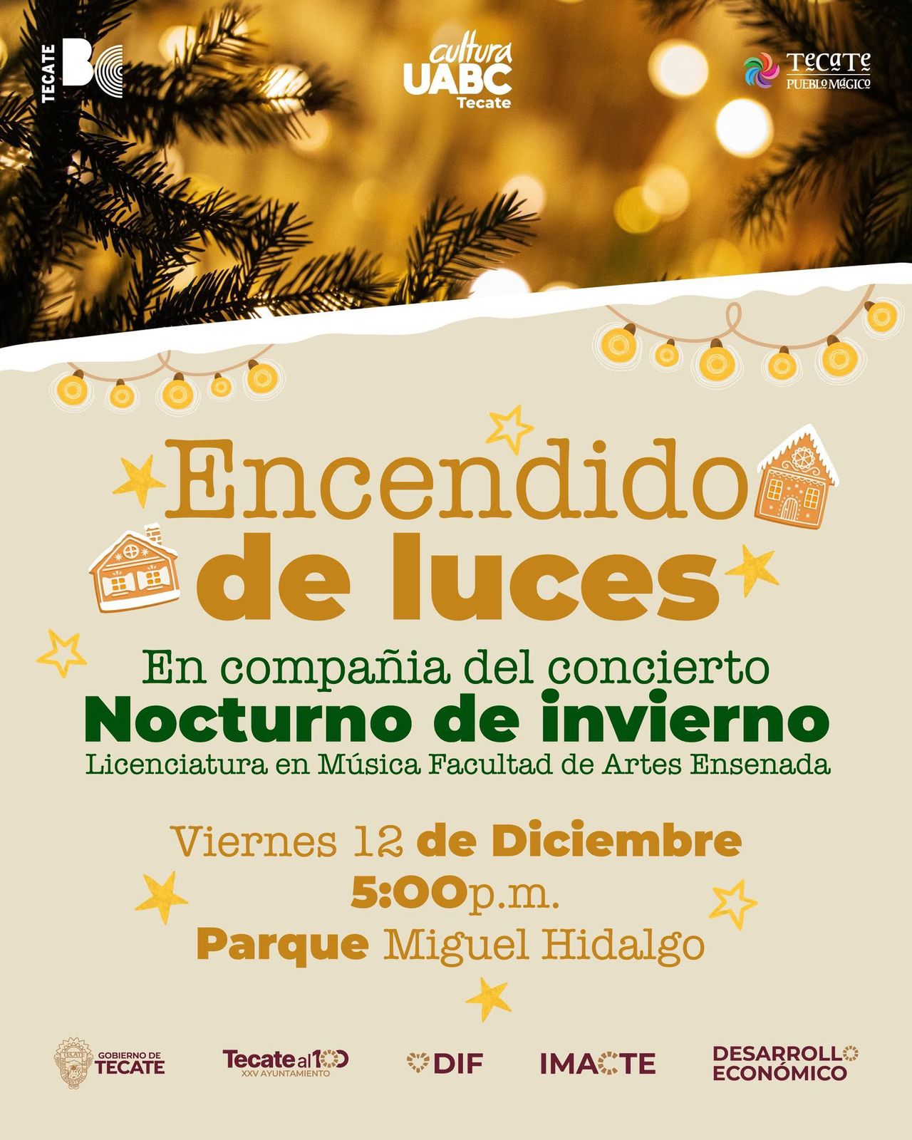 TECATE BC, 08 de diciembre de 2025.- El Gobierno de Tecate, invita a todas las familias tecatenses a disfrutar del tradicional Encendido de Luces Navideñas, un evento que dará inicio a la temporada decembrina en un ambiente lleno de música y alegría.