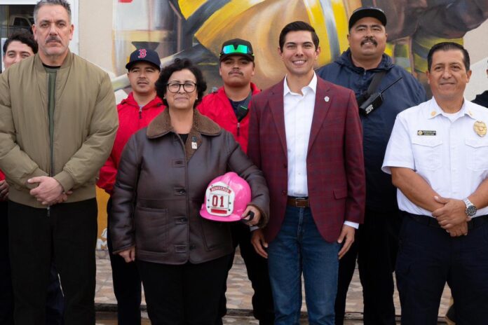 Como muestra de gratitud, el alcalde Román Cota hizo entrega de un casco conmemorativo en color rosa, símbolo del agradecimiento de las y los tecatenses, además de una placa de reconocimiento dirigida al Heroico Cuerpo de Bomberos de Rosarito.