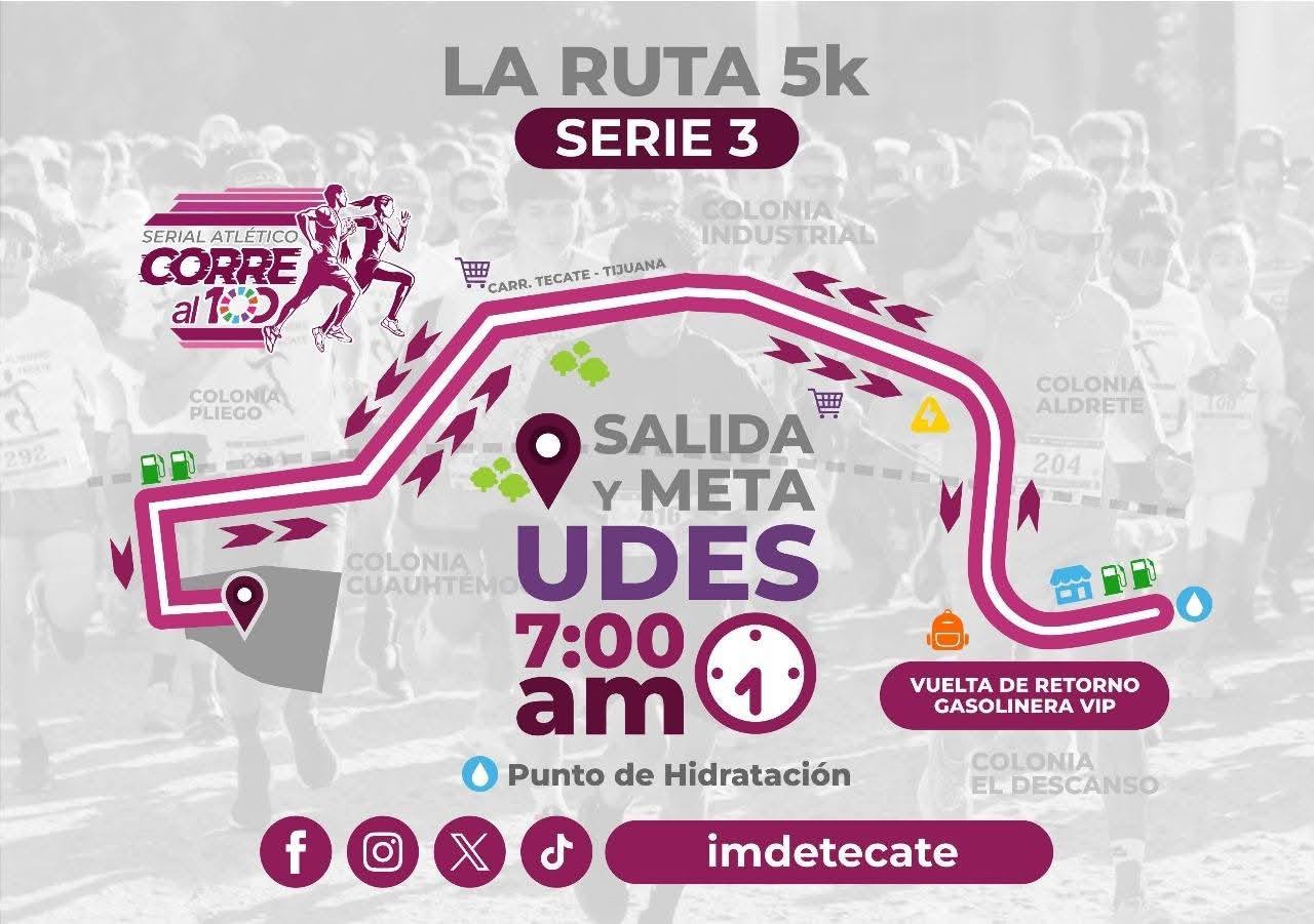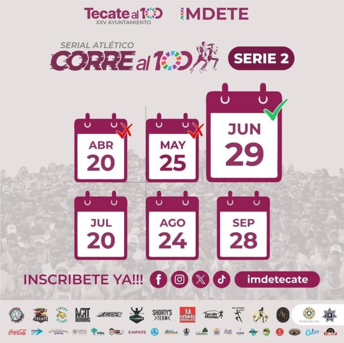 TECATE BC, 26 de junio de 2025.- El Gobierno Municipal de Tecate, a través del Instituto Municipal del Deporte (IMDETE), invita a toda la comunidad a ser parte de la tercera fecha del Serial Atlético “Corre al 100”, que se llevará a cabo este domingo 29 de junio, con punto de salida y meta en la Unidad Deportiva Eufrasio Santana, en punto de las 7:00 de la mañana.