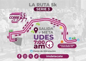 La Serie 3 de esta justa deportiva contará con una ruta de 5 kilómetros, trazada por calles principales del municipio, con punto de retorno en la gasolinera VIP y estaciones de hidratación a lo largo del recorrido, garantizando una experiencia segura y dinámica para participantes de todas las edades.