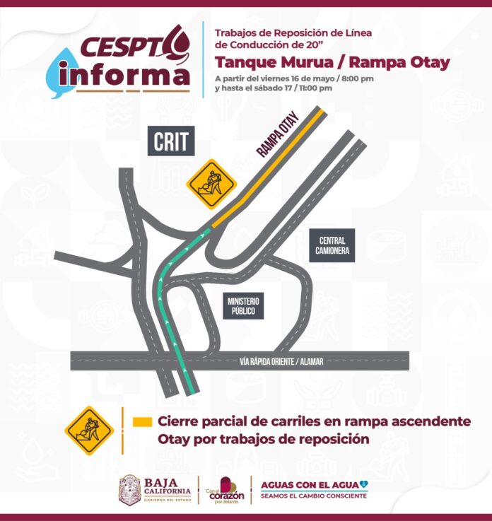 TIJUANA BC, 16 de mayo de 2025.- La Comisión Estatal de Servicios Públicos de Tijuana (CESPT) informa que hoy, viernes 16 de mayo, se llevarán a cabo trabajos de rehabilitación en la línea de conducción de agua potable del Tanque Murúa, a partir de las 20:00 horas, donde se instalarán 24 metros de tubería de hierro dúctil de 20 pulgadas de diámetro, en el tramo ubicado sobre la rampa ascendente hacia Otay, a la altura de la central camionera, en la Avenida Rápida Alamar.