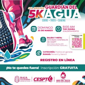 TIJUANA BC, 26 de febrero de 2026.– A partir del viernes 27 de febrero, la Comisión Estatal de Servicios Públicos de Tijuana (CESPT) abre la convocatoria para participar en la cuarta edición de la carrera recreativa 5K “Guardián del Agua”, que se realizará el domingo 22 de marzo de 2026, en el marco del Día Mundial del Agua.