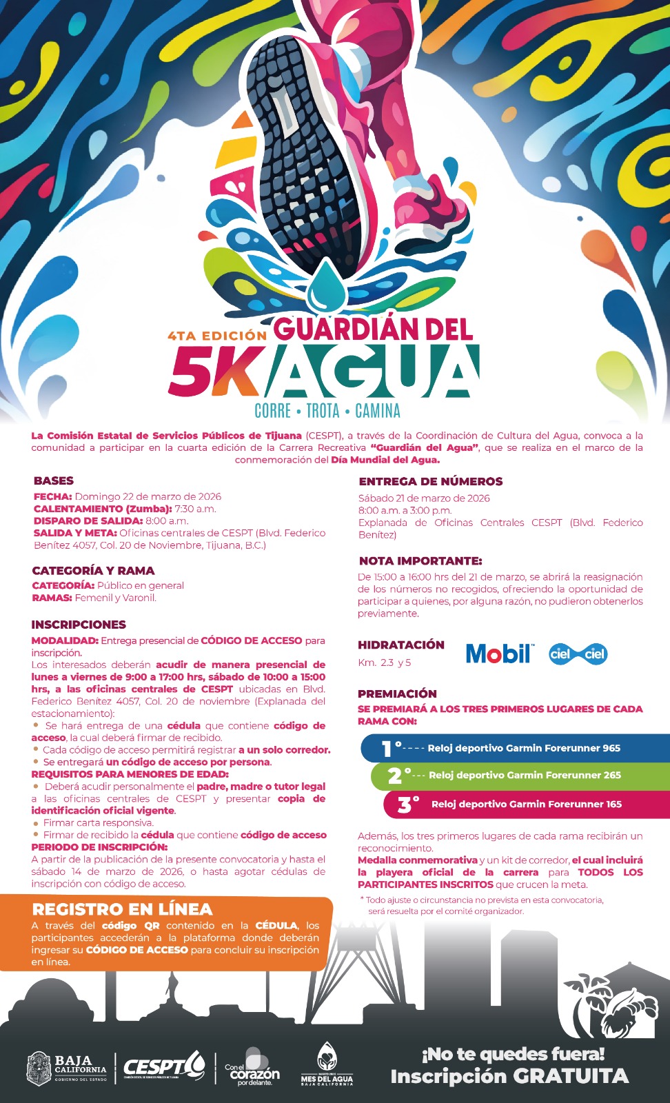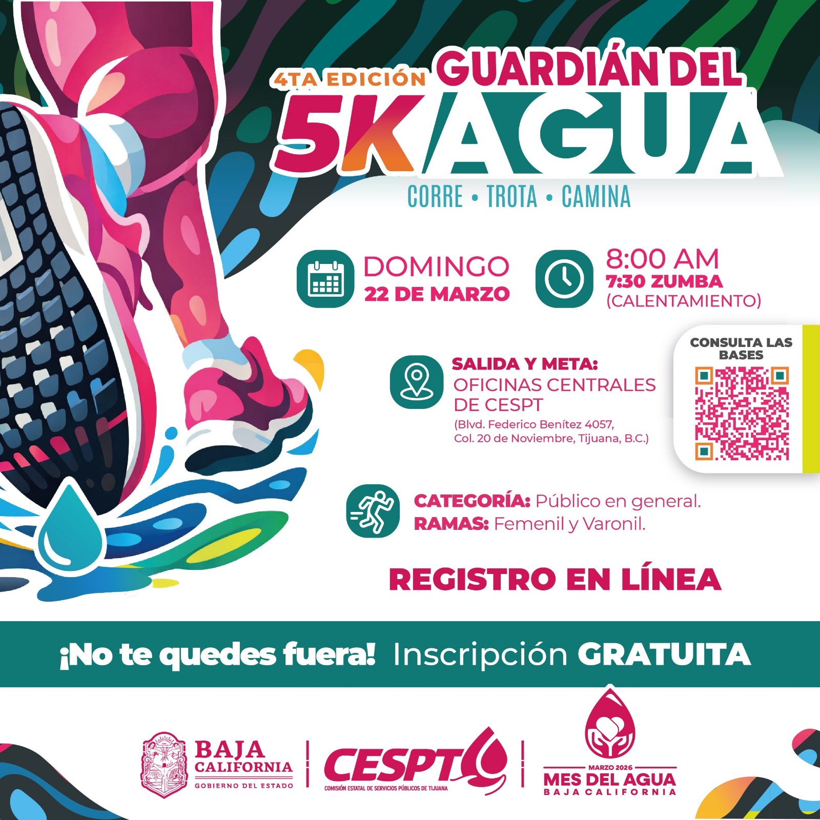 TIJUANA BC, 26 de febrero de 2026.– A partir del viernes 27 de febrero, la Comisión Estatal de Servicios Públicos de Tijuana (CESPT) abre la convocatoria para participar en la cuarta edición de la carrera recreativa 5K “Guardián del Agua”, que se realizará el domingo 22 de marzo de 2026, en el marco del Día Mundial del Agua.