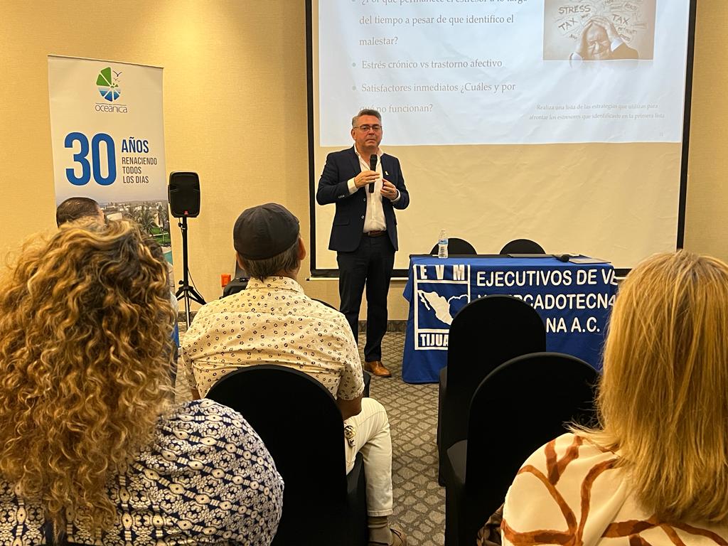 TIJUANA BC, 04 de octubre de 2023.- Con el fin de que los empresarios puedan identificar problemas emocionales en sus colaboradores, la Asociación de Ejecutivos de Ventas (EVM) de Tijuana llevó a cabo la conferencia “Bienestar emocional en la empresa”, por parte de Oceánica.