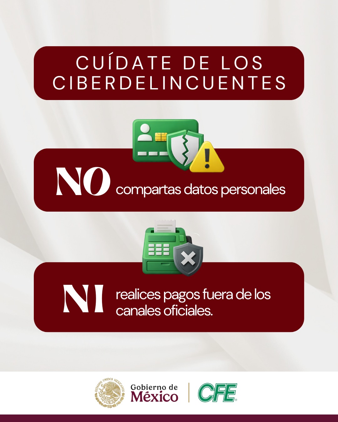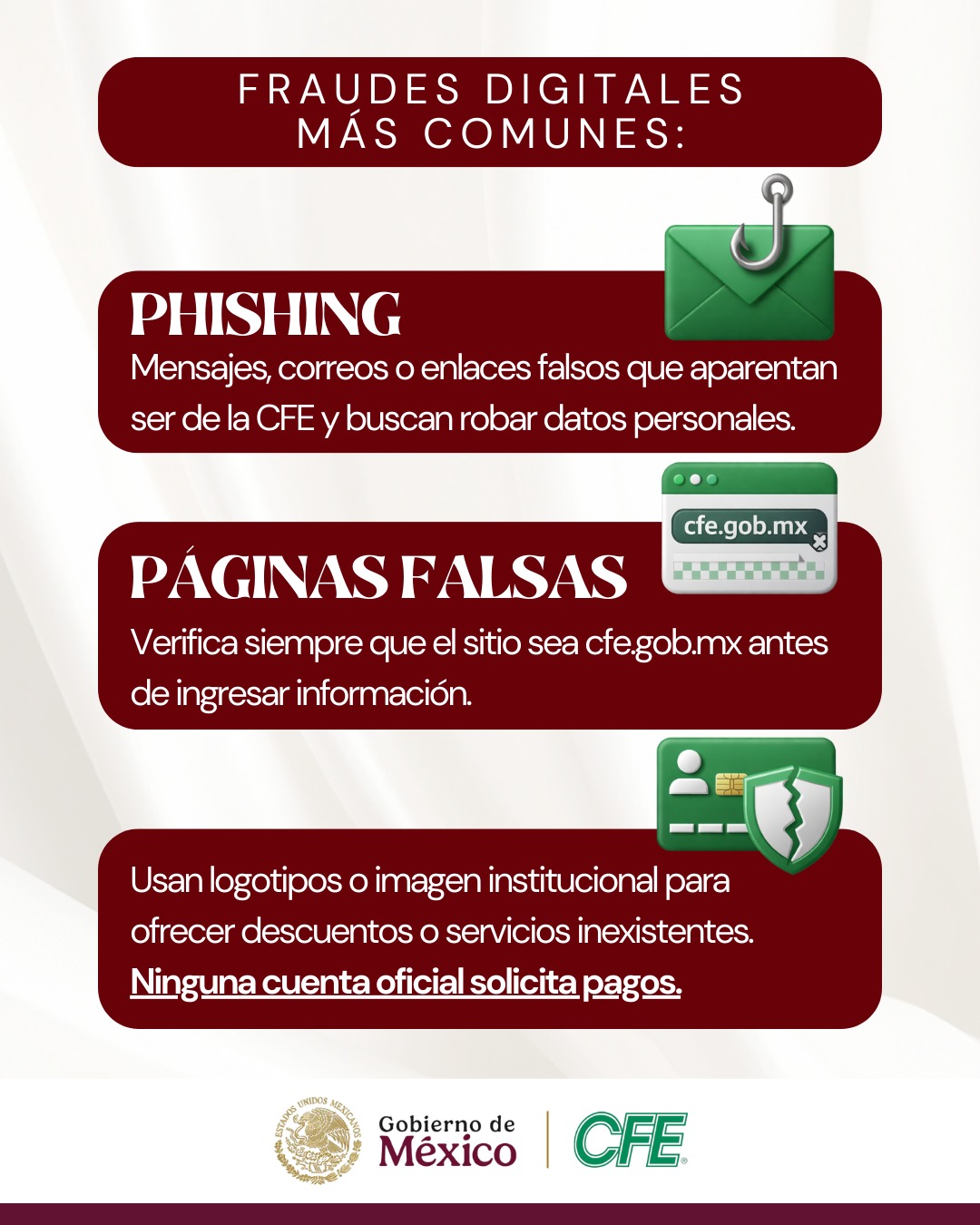 • Páginas falsas en redes sociales: con logotipos de la CFE o uso indebido de la imagen institucional, se ofrecen servicios inexistentes como descuentos o maniobras para alterar medidores y otra infraestructura eléctrica. Estas prácticas, en el mejor de los casos, venden productos que no sirven; en el peor, son un gancho para la extorsión o el fraude. Las únicas cuentas oficiales de CFE en redes sociales son, en Facebook, CFE Nacional, en X, cfemx, en Instagram, cfe_nacional, en TikTok, cfe_nacional. Ninguna te solicitará algún tipo de pago.