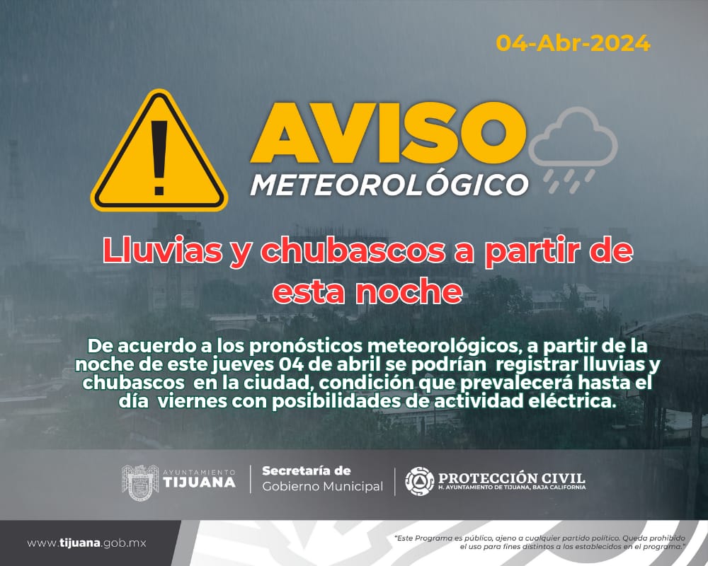 TIJUANA BC, 04 de abril de 2024.- De acuerdo a los pronósticos meteorológicos, a partir de la noche de este jueves 04 de abril se podrían  registrar lluvias y chubascos  en la ciudad, condición que prevalecerá hasta el día  viernes con posibilidad de actividad eléctrica.