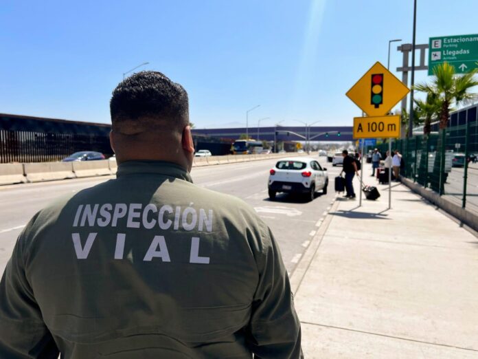 TIJUANA BC, 18 de junio de 2025. El gobierno municipal de la ciudad refuerza las labores de auxilio vial en las zonas de ascenso y descenso de transporte público ubicadas frente al Aeropuerto Internacional de Tijuana.