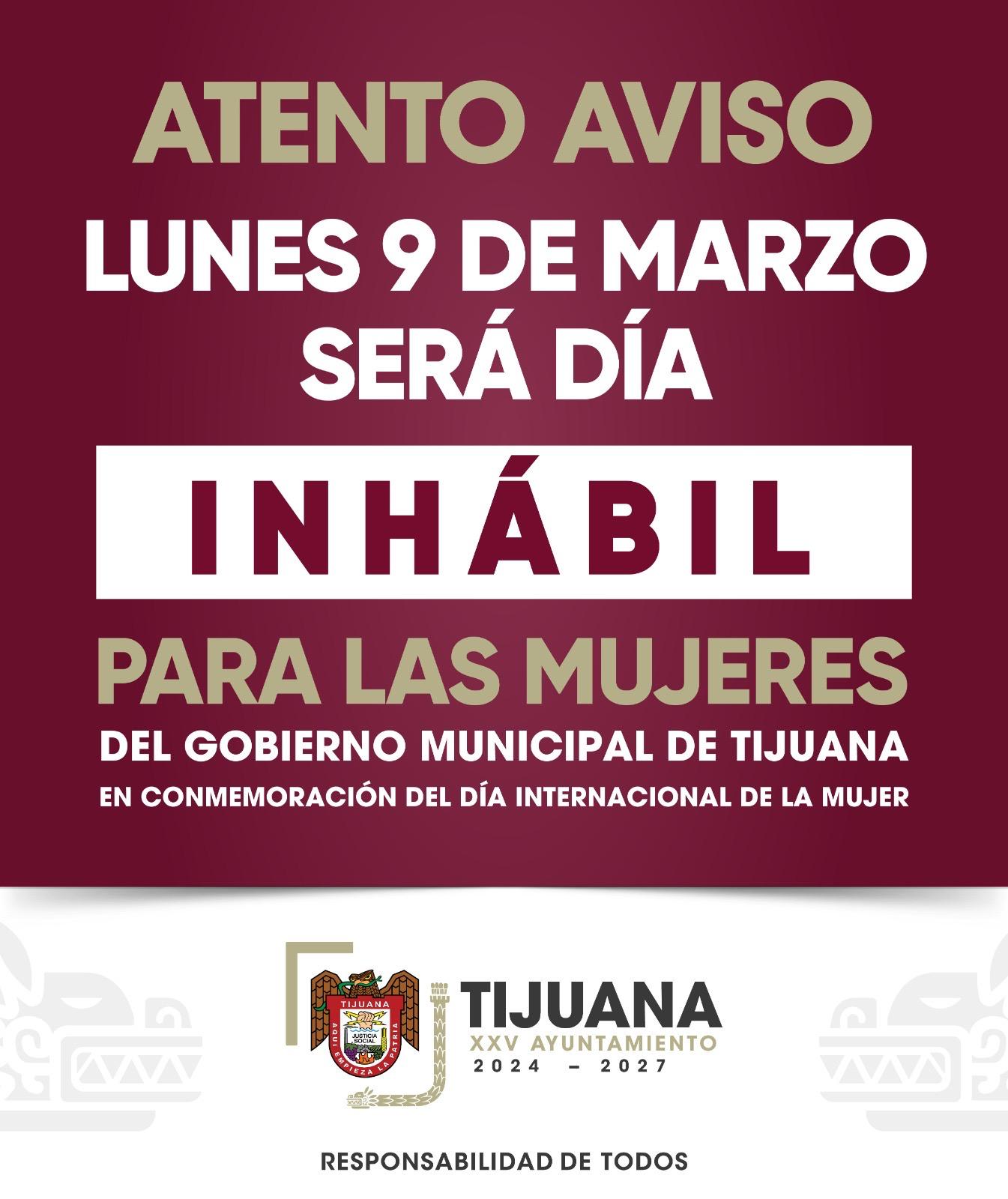 TIJUANA BC, 06 de marzo de 2026.- El XXV Ayuntamiento de Tijuana informa a la ciudadanía que el próximo lunes 9 de marzo será considerado día de asueto para todas las mujeres que laboran en las oficinas de Palacio Municipal, delegaciones y dependencias paramunicipales.