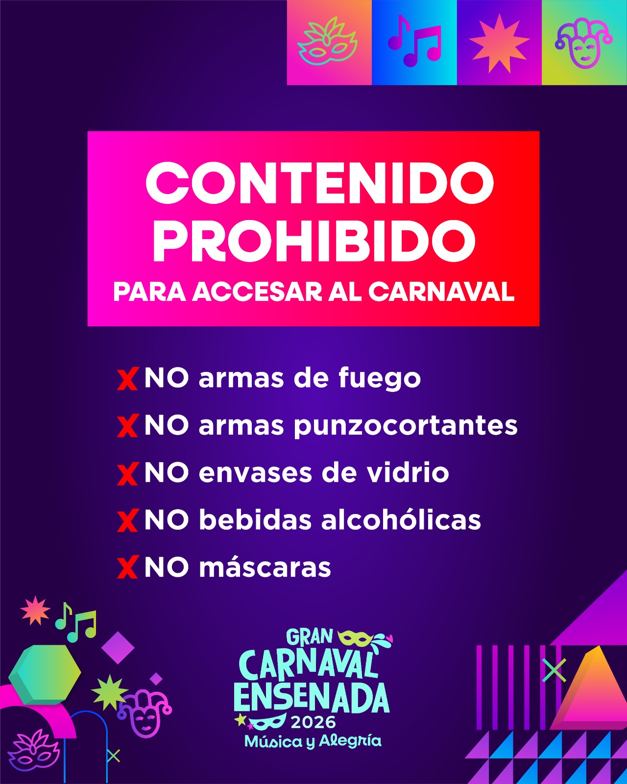 ENSENADA BC, 12 de marzo de 2026.- Con motivo de la celebración del Gran Carnaval Ensenada 2026, el Gobierno de Ensenada hace un llamado a la ciudadanía y visitantes a disfrutar de las actividades con responsabilidad, atendiendo las recomendaciones preventivas de  la Dirección de Seguridad Pública Municipal (DSPM) que permitan mantener un ambiente de orden, seguridad y sana convivencia durante los festejos.