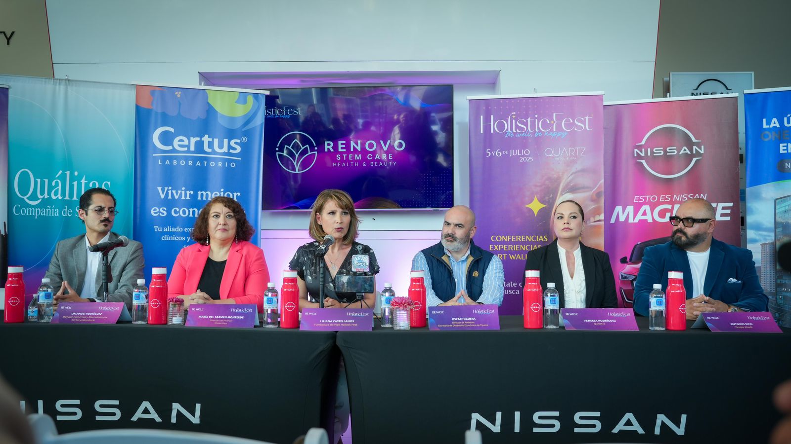 La presentación de los detalles del Holistic Fest estuvo encabezada por Lili Castellanos, acompañada por Antonio Rico, de Grupo Abadi; Vanessa Rodriguez, CEO de Qualitas; Oscar Higuera, Director de Fomento de la Secretaría de Desarrollo Económico de Tijuana; Orlando Rodriguez, Director Comercial y Mercadotecnia de Certus Laboratorio; y María del Carmen Monterde, Directora de Finanzas de Nissan Baja.