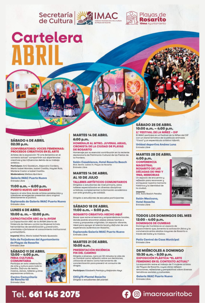Playas de Rosarito.- Fomentar el arte y la convivencia comunitaria es el eje central de la agenda cultural que el 10° Ayuntamiento de Playas de Rosarito presenta para este mes. A través del IMAC, se han diseñado una serie de eventos gratuitos que van desde conversatorios de arte contemporáneo hasta mercados de obra original al aire libre, consolidando espacios para el talento local.